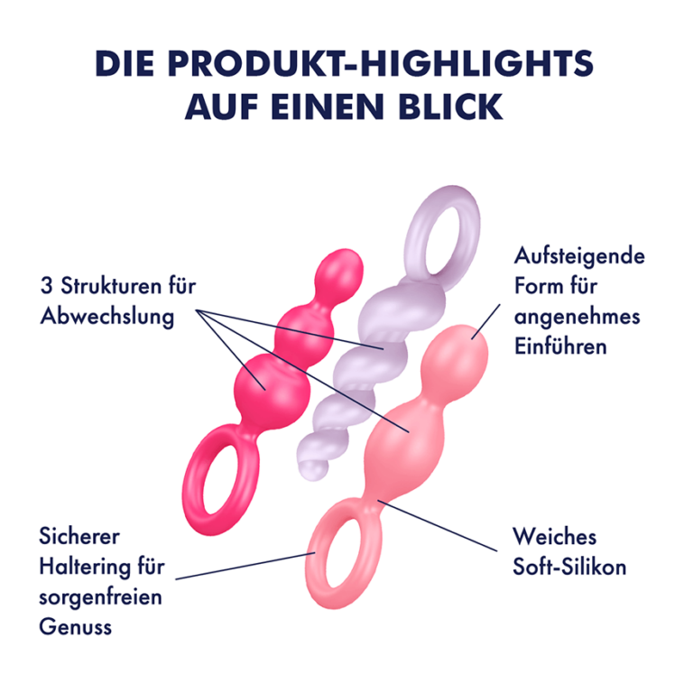 Le plug anal Booty Call Set de Satisfyer offre aux débutants les conditions idéales pour un entraînement anal grâce à 3 structures variées. Les plugs anaux ont un diamètre progressif pour étirer lentement votre anus. Du design en spirale torsadée à la forme conique étroite en passant par la boule classique, il y en a pour tous les goûts. Les 3 modèles convainquent par leur silicone souple hygiénique et doux pour la peau et leur surface lisse. L'anneau de retenue pratique facilite l'insertion de l'anus.