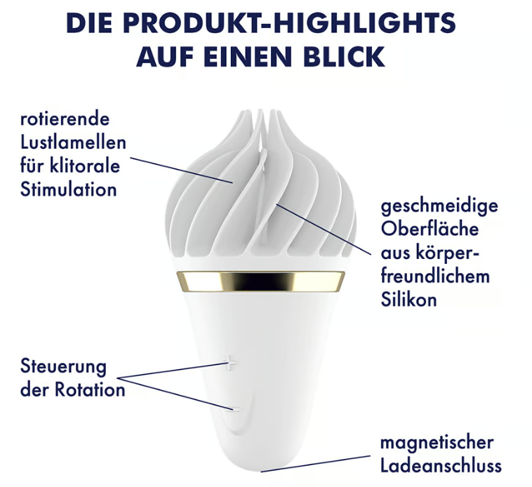 Le Satisfyer Sweet Treat n'est pas seulement un accroche-regard, mais aussi un régal pour les sens. Ce vibromasseur clitoridien au design unique, en forme de boule de glace sur un cône, surprend avec des ailettes rotatives qui mettent votre clitoris dans des sommets extatiques. Son silicone doux et doux pour la peau caresse doucement vos zones les plus sensibles et offre des moments puissants et sensuels, partout où vous en avez envie. Sa poignée en forme de gaufre assure une prise en main confortable, tandis que vous pouvez contrôler sans effort les 10 modes de vibrations alléchants, composés de 4 rythmes de rotation et 3 vitesses dans les deux sens, via les boutons intuitifs +/-. Un doux plaisir de la classe supplémentaire !