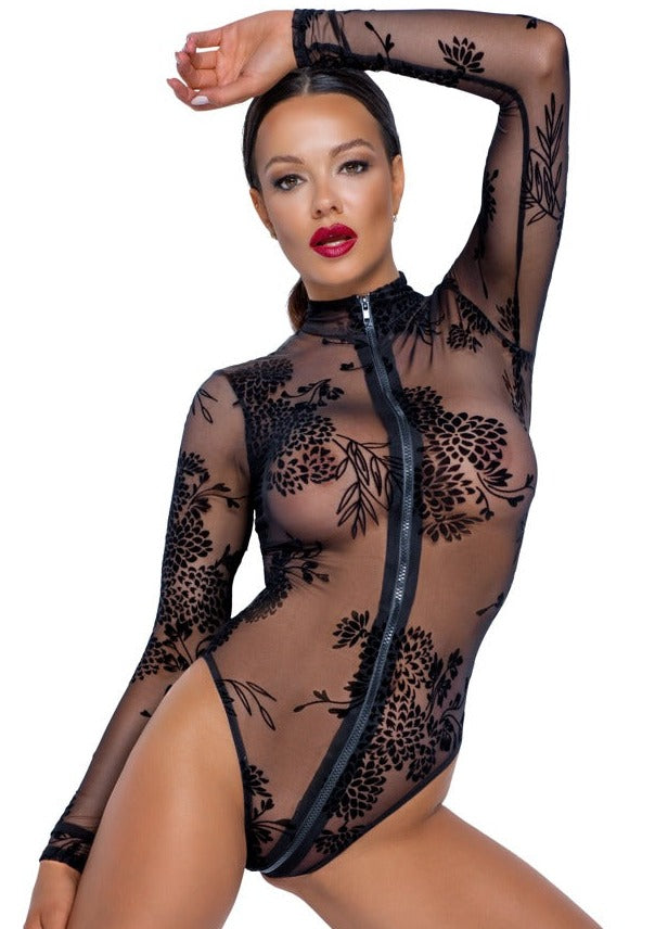 Langarm-Body von Noir, gefertigt aus dehnbarem Powernet, bietet eine sinnliche Transparenz. Verziert mit einem delikaten Samtflockprint im Blumenmuster. Ein ansprechend-erotischer 3-Wege-Reissverschluss zieht sich von vorne, vom Stehkragen, bis hinunter in den Schritt. Für Noir wird eine separate Größentabelle bereitgestellt.