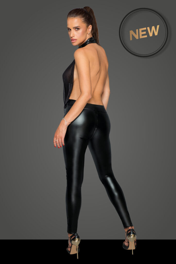 Eleganter Overall, kombiniert mit einem Powerwetlook Choker und einem zarten Tüll-Oberteil, das mit einem Wasserfallausschnitt beeindruckt. Ein Reißverschluss im Schritt rundet das Design ab.