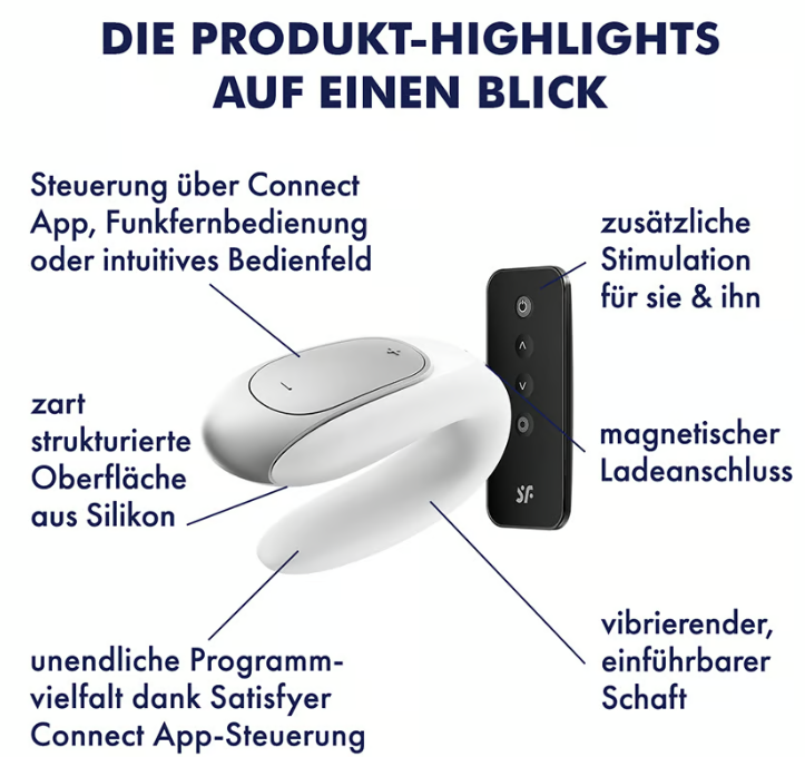 Der Satisfyer Double Fun verleiht Eurer Intimität eine kraftvolle, sinnliche Dimension. Dieser Partnervibrator in U-Form peppt Euer Liebesspiel auf, indem er sowohl den Penis als auch den G-Punkt mit seinem einführbaren Schaft stimuliert. Währenddessen sorgt ein zweiter Motor am anderen Ende für gezielte Klitorisstimulation. Hergestellt aus hautfreundlichem Silikon, schmeichelt er sich besonders weich an Eure Haut. Und auch im Wasser könnt Ihr ungestört weitermachen: Dank seiner wasserdichten (IPX7) Verarbeitung eignet er sich hervorragend für feuchtfröhliche Momente in Dusche oder Badewanne. Und sollte dem Satisfyer Double Fun einmal die Energie ausgehen, könnt Ihr seine Akkus einfach mit dem mitgelieferten USB-Kabel aufladen. Erlebt doppelte Freude mit doppelter Wirkung!
