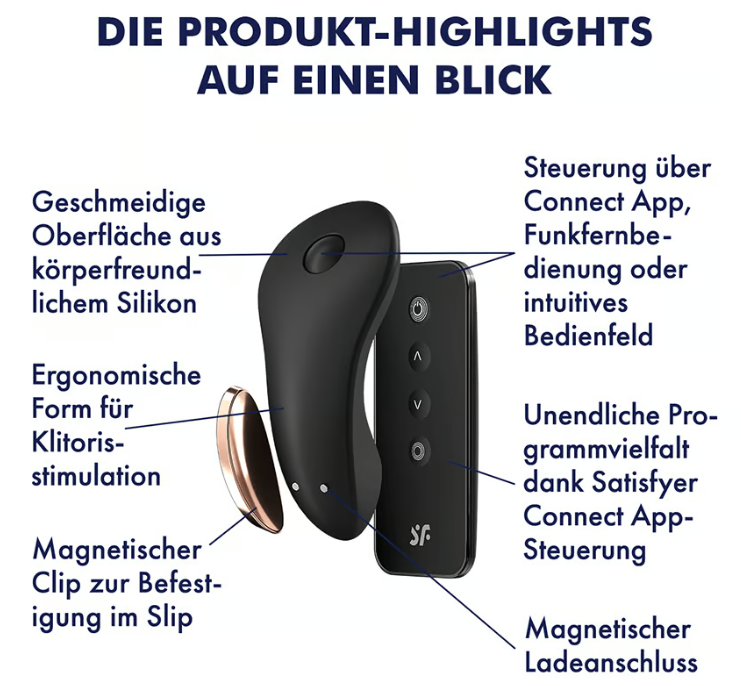 Der Little Secret von Satisfyer ist Dein diskreter Begleiter im Alltag: Dieser Klitorisvibrator wird mittels eines magnetischen Clips im Slip fixiert und sorgt so für versteckte Genussmomente unterwegs. Sein elegantes Design in Schwarz mit goldenen Akzenten lässt ihn nicht nur optisch glänzen. Durch seine ergonomische Gestaltung schmiegt er sich perfekt an die Klitoris an. Seine kräftigen, aber flüsterleisen Vibrationen garantieren Diskretion. Das samtweiche, hautfreundliche Silikon fühlt sich wunderbar auf der Haut an und bietet in Kombination mit ein wenig Gleitgel ein reibungsloses Vergnügen. Und selbst wenn es feucht wird, wie in der Dusche oder Badewanne, bleibt der Little Secret dank seiner wasserdichten (IPX7) Beschaffenheit Dein treuer Partner.