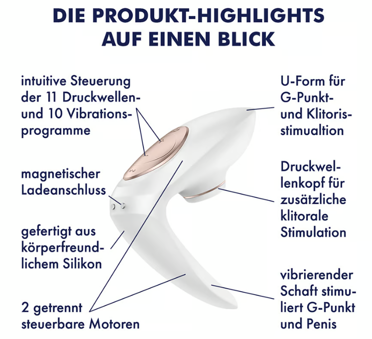 Der Satisfyer Pro 4 Couples verspricht beiderseitiges Vergnügen. Er bietet Paaren eine intensivierte Erfahrung und bringt Schwung ins Schlafzimmer. Der schmal gestaltete Teil des Vibrators wird während der Intimität in die Vagina eingeführt und bietet mit 10 Vibrationsmodi einen verführerischen Start in gemeinsame Höhepunkte. Während er von einer erhöhten Intensität profitiert, bekommt sie zusätzlichen Druck auf ihren G-Punkt. Der äußere Teil des Geräts stimuliert gleichzeitig die Klitoris mit eindrucksvollen Druckwellen und sorgt für ein unvergessliches Erlebnis. Mit diesem Gerät könnt ihr euch auf unvergleichliche Höhepunkte und sensationelle Momente der Zweisamkeit freuen.