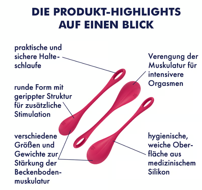 Die Satisfyer Yoni Power 1 ermöglichen Dir ein effektives Beckenbodentraining und verhelfen zu intensiveren Orgasmen. Im Unterschied zu anderen Liebeskugeln liegt der Schwerpunkt bei den Yoni Power 1 nicht nur auf dem Gewicht, sondern besonders auf den verschiedenen Größen der Kugeln. Der Trainingsprozess beginnt mit der größten und schwersten Kugel (3 cm Durchmesser, 74 g) und führt dann über die mittlere (2,5 cm Durchmesser, 46 g) bis zur kleinsten und leichtesten (2 cm Durchmesser, 22 g). Mit regelmäßigem Training wird Deine Beckenbodenmuskulatur straffer, wodurch es Dir leichter fällt, die Kugel mit dem kleinsten Durchmesser zu halten. Schon 15 Minuten tägliches Training mit diesen Liebeskugeln genügen, um einen merklichen Effekt zu erzielen, den sowohl Du als auch Dein Partner beim Vaginalverkehr spüren werden. Das gerippte Design der Kugeln sorgt dabei für zusätzliche Stimulation während des Trainings.